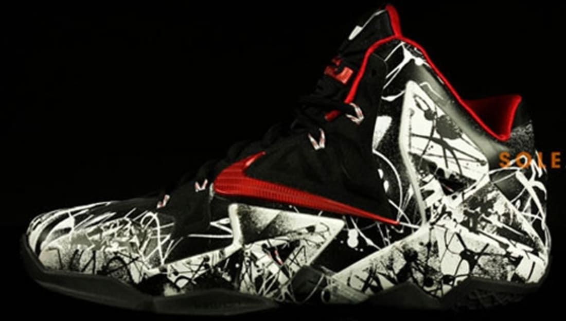 This Nike LeBron 11 is known as the "Graffiti" edition. It comes in a white, university red and black colorway. Featuring a black-based upper with a unique white graffiti-like design throughout finished off by red accents. A general release, look out for these at select Nike accounts worldwide in late January of 2014. Retail is set at $200 for men's and, they will also be available in full family sizing running down to toddler.